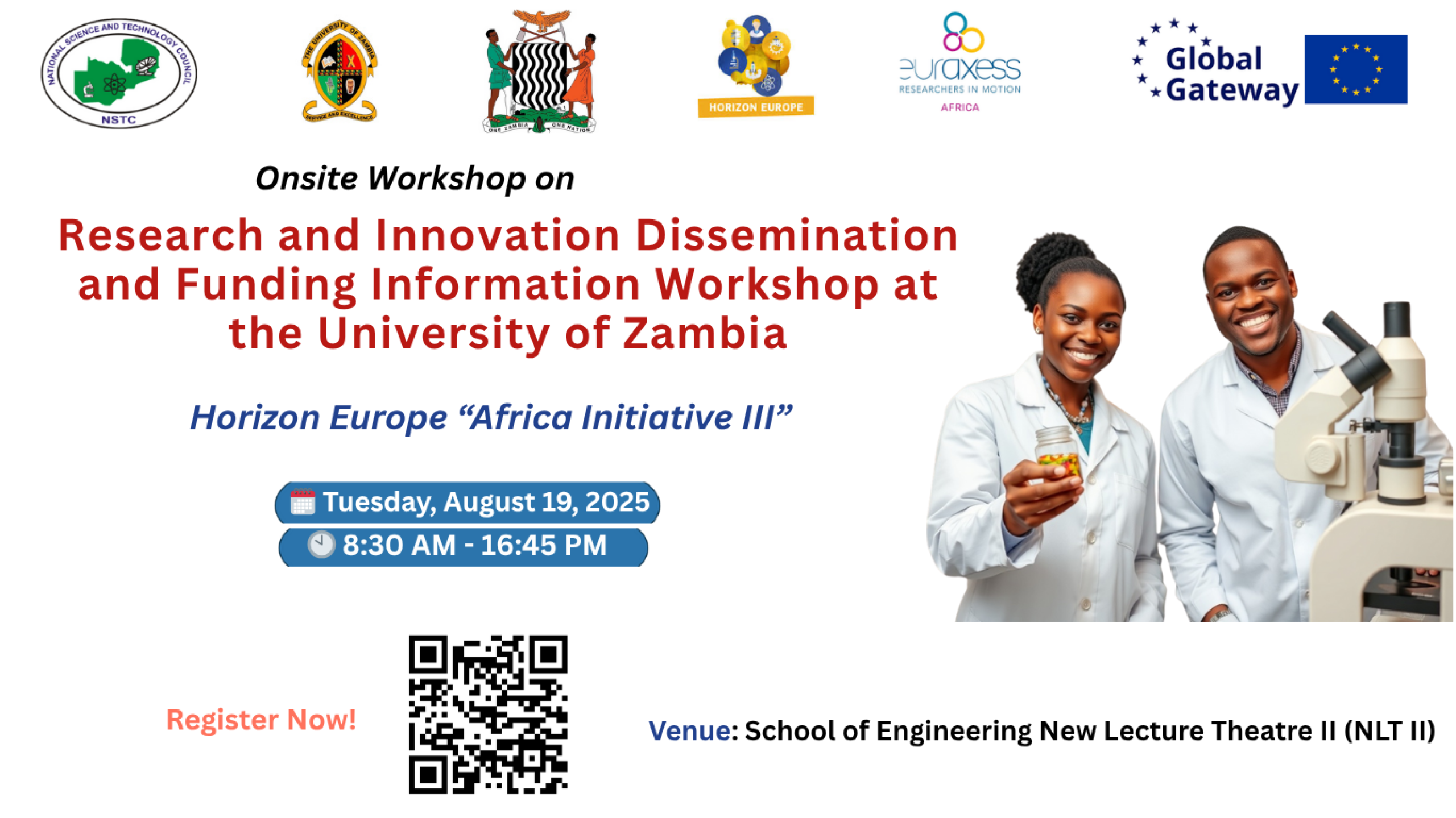 The Research and Innovation Dissemination and Funding Information Workshop aims to provide a platform for researchers in Zambia to explore funding opportunities and enhance collaborative efforts. With the increasing importance of research and innovation in addressing both local and global challenges, this workshop seeks to equip participants with the necessary knowledge and skills to navigate various funding landscapes, including those offered by the National Science and Technology Council (NSTC) and Horizon Europe. Notably, the recently launched Horizon Europe “Africa Initiative III,” which features 24 call topics and a total budget of over 500 million euros, will be presented in detail to the participants.